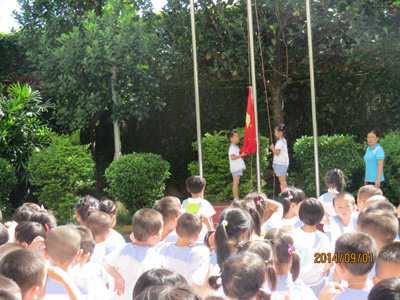 雄壮的国歌在幼儿园响起,鲜艳的国旗在幼儿园上空飘扬。开学第一天,田心幼儿园全体师生精神抖擞的汇聚在操场,举行开学典礼。