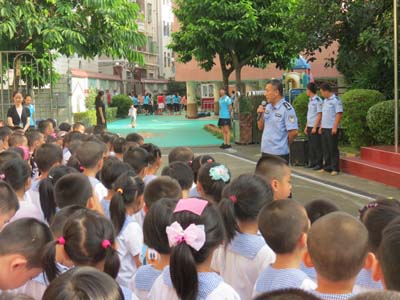 2013年7月12日早上田心幼儿园组织全体小朋友在幼儿园大操场开展《假期安全教育活动》,特邀请社区民警给孩子们讲解有关假期安全的注意事项,如不玩火、不玩电、不独自游泳、不给陌生人开门、不爬阳台、安全过马路等等。通过活动,进一步提高了孩子们的安全防范意识。