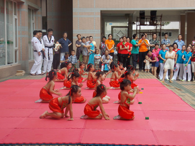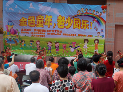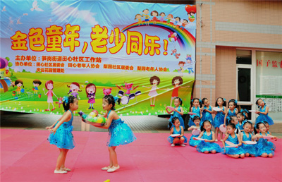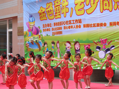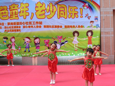 我们幼儿园受田心社区的厚爱,于2014年5月29日参加了田心社区“六一迎端午”金色童年、老少同乐的活动。在田心庆云花园的广场上,我们的小朋友给大家带来了舞蹈——《小机灵》和《十一点半》,许老师带来了独唱——《欢天喜地》,还有梨园和田心老协会带来深圳秧歌、第七套柔力球表演和舞蹈,最后还有跆拳道和田心工作站全体员工大合唱。
